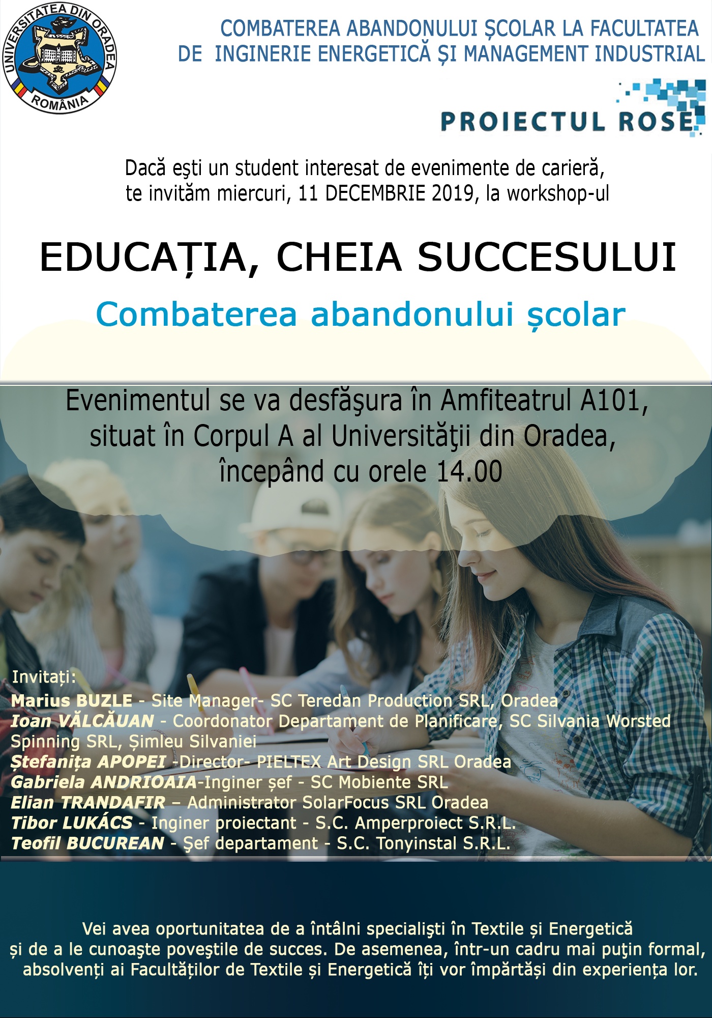 Miercuri 11 decembrie 2019, de la ora 14, în pavilionul A al Universității din Oradea, sala A101, va avea loc Workshopul-ul: Educația, cheia succesului - Reducerea abandonului școlar